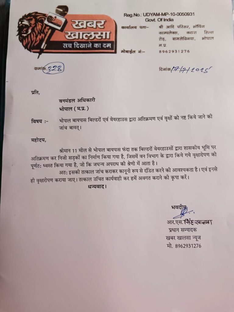 वहीं दूसरी तरफ पर्यावरण की सुरक्षा को लेकर मंत्रियों के बड़ी-बड़ी घोषणाओं पर पालन करवाने के लिए राजधानी का डिजिटल न्यूज़ चैनल खबर खालसा अपना सहयोग करता रहता है भोपाल बाईपास पर बिल्डरों वेयरहाउस संचालकों द्वारा वृक्षों एवं फेंनसिंग को नष्ट किए जाने की शिकायत वन मंडल अधिकारी भोपाल लोकप्रिय भारती को लिखित देकर संज्ञान में दिया है कि वह बारीकी से इसकी जांच करवाएं फेंनसिंग एवं वृक्षों को नष्ट करने वाले दोषियों पर कड़ी से कड़ी कानूनी कार्यवाही करके जुर्माना भी लगाऐ।