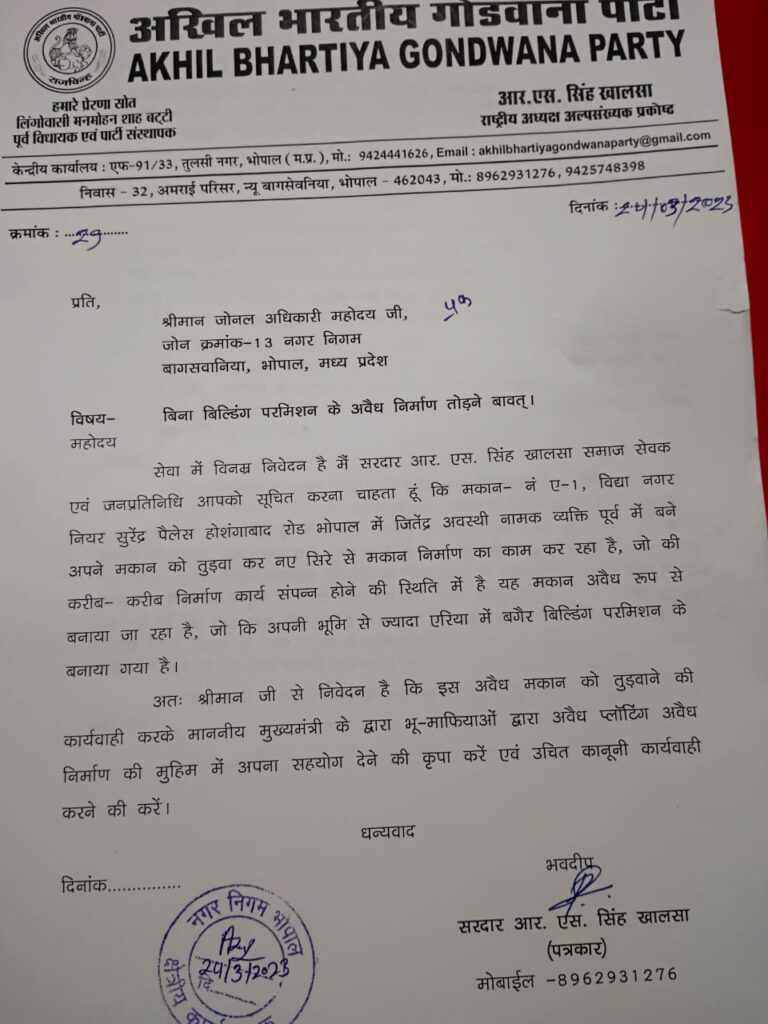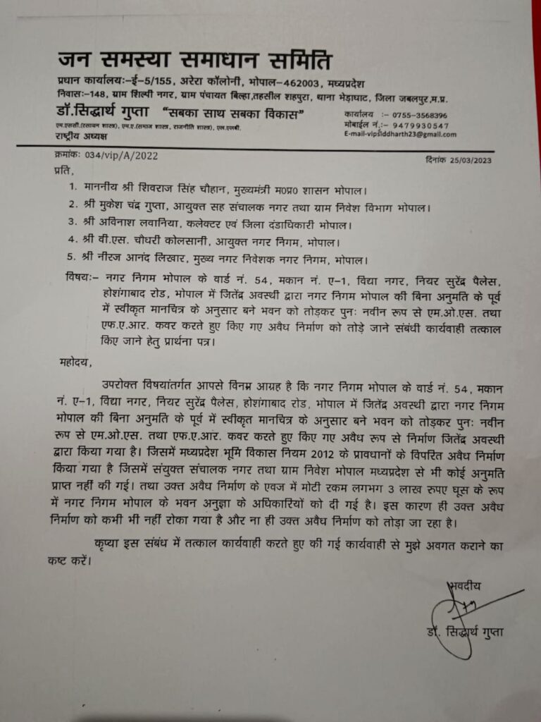 भोपाल . राजधानी भोपाल के होशंगाबाद रोड युनिवर्सिटी स्थित मकान नं ए 1.विद्यानगर जिसका मकान मालिक जितेंद्र अवस्थी नामक व्यक्ति हैं उसके द्वारा पूर्व में बने पुराने मकान को तोड़कर दो मंजिल मकान अवैध तरीके से बना डाला गया हैं, इतना ही नहीं प्लॉट साइज के अलावा आसपास की जमीन को घेरकर उस पर भी निर्माण बेधड़क कर डाल।