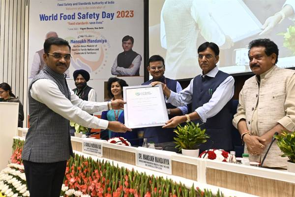 केंद्रीय स्वास्थ्य और परिवार कल्याण मंत्री डॉ. मनसुख मांडविया और केन्द्रीय राज्य मंत्री प्रो. सत्यपाल सिंह बघेल ने इस अनुकरणीय प्रदर्शन के लिए विश्व खाद्य सुरक्षा दिवस पर विज्ञान भवन, नई दिल्ली में मध्यप्रदेश के खाद्य सुरक्षा आयुक्त डॉ. सुदाम खाड़े को प्रशस्ति-पत्र देकर सम्मानित किया।