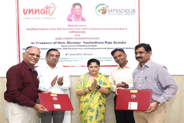 तकनीकी शिक्षा कौशल विकास एवं रोज़गार मंत्री श्रीमती यशोधरा राजे सिंधिया की उपस्थिति में मध्यप्रदेश राज्य कौशल विकास और रोज़गार निर्माण बोर्ड ने बेंगलुरू स्थित व्यावसायिक प्रशिक्षण और सामाजिक परिवर्तन फ़ाउंडेशन उन्नति संस्था के साथ 50 हज़ार युवाओं के रोज़गार कौशल प्रशिक्षण के लिए 3 साल से अधिक के लिए साझेदारी की है। संस्था प्रथम वर्ष में 15 हज़ार युवाओं को रोज़गार कौशल में प्रशिक्षित करेगी।