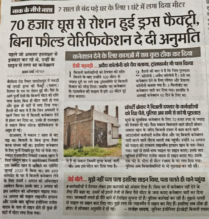 भोपाल. राजधानी में मध्य प्रदेश विद्युत वितरण कंपनी ईंटखेड़ी डीसी का घूसखोर जेई अपने आप को बचाने के चक्कर में भाग कर जा बैठा सूखी सेबनियां डीसी में। यहां ज्ञात कराते चलें अगस्त 2025 में बैरसिया रोड स्थित जगदीशपुर में पकड़ीं गई ड्रग्स फैक्ट्री में 70 हजार रुपए की घूस खाकर कुछ ही घंटों में बिजली मीटर बिना फील्ड वेरिफिकेशन के अनुमति देने वाला जूनियर इंजीनियर राजेश यादव अपने आप को बचाने की जुगाड़ में जुटा हुआ हैं, यही कारण हैं जो वह ड्रग्स कांड वाले एरिया को छोड़ दूसरे एरिया में भाग गया। ड्रग्स फैक्ट्री में बिजली कनेक्शन देने के लिए इतनी फुर्ती दिखाई 1अगस्त को आंफ लाईन आवेदन किया 3 अगस्त को इस आवेदन को ऑनलाइन चढ़ाया गया और 14अगस्त को फाइल पर लाइनमैन इरफान और जुनियर इंजीनियर राजेश यादव ने आनन-फानन में फाइल पर हस्ताक्षर कर दिए और कुछ ही घंटों में बिजली मीटर लगा दिया , इस तरह की फुर्ती दिखाने का कारण 70 हजार रुपए की घूस था। जब यह मामला मीडिया ने उठाया तो विभाग के आला अधिकारियों ने अपनी शाख बचानें के लिए अदने से कर्मचारियों को सूली चढ़ा दिया उन्हें जेल भिजवा दिया। जबकि इस प्रकरण में गैरजिम्मेदार, देशद्रोही,समाज के दुश्मन जुनियर इंजीनियर राजेश यादव एवं लाइनमैन इरफान को जेल भेजा जाना था क्योंकि यह संभव ही की बगैर इनकी सहमति के इस कांड को अंजाम दिया जाता। इस सारे प्रकरण में जानकारी लेनी चाही तो विभाग के जिम्मेदार पीआरओ मनोज द्विवेदी और डीई नवनीत गुप्ता ने फोन तक नहीं उठाया। ऊपर से भ्रष्ट देशद्रोही जेई राजेश यादव को बचातें हुए सूखीसेबनियां डीसी में सुरक्षित बैठा दिया। सूत्र बताते रहे हैं इस जेई की गुंडागर्दी वहां पर भी देखने को मिल रही हैं सूखी डीसी के कर्मचारी भी इनसे नाराज चल रहे हैं।